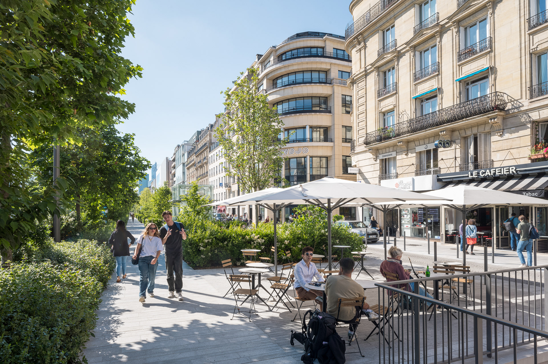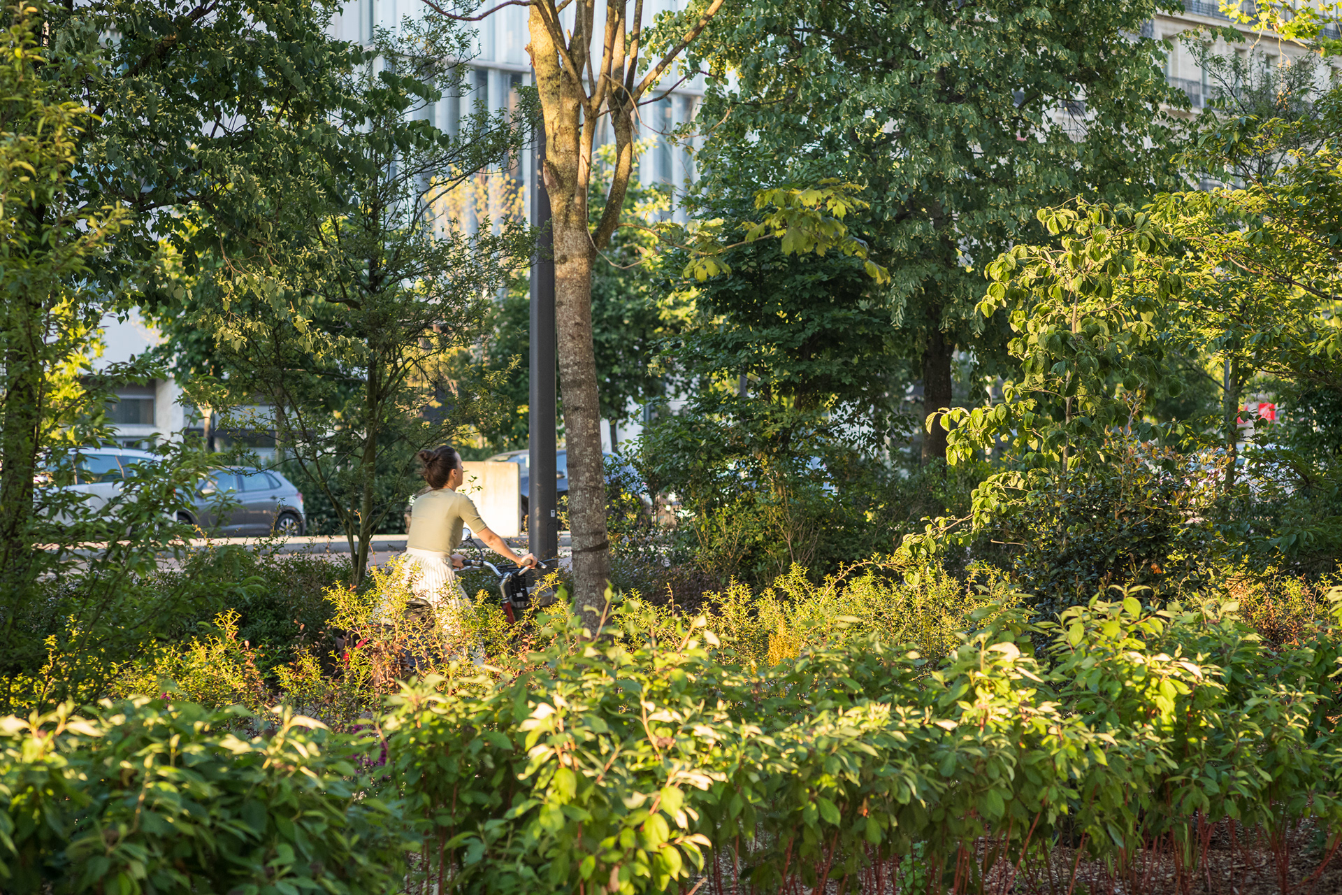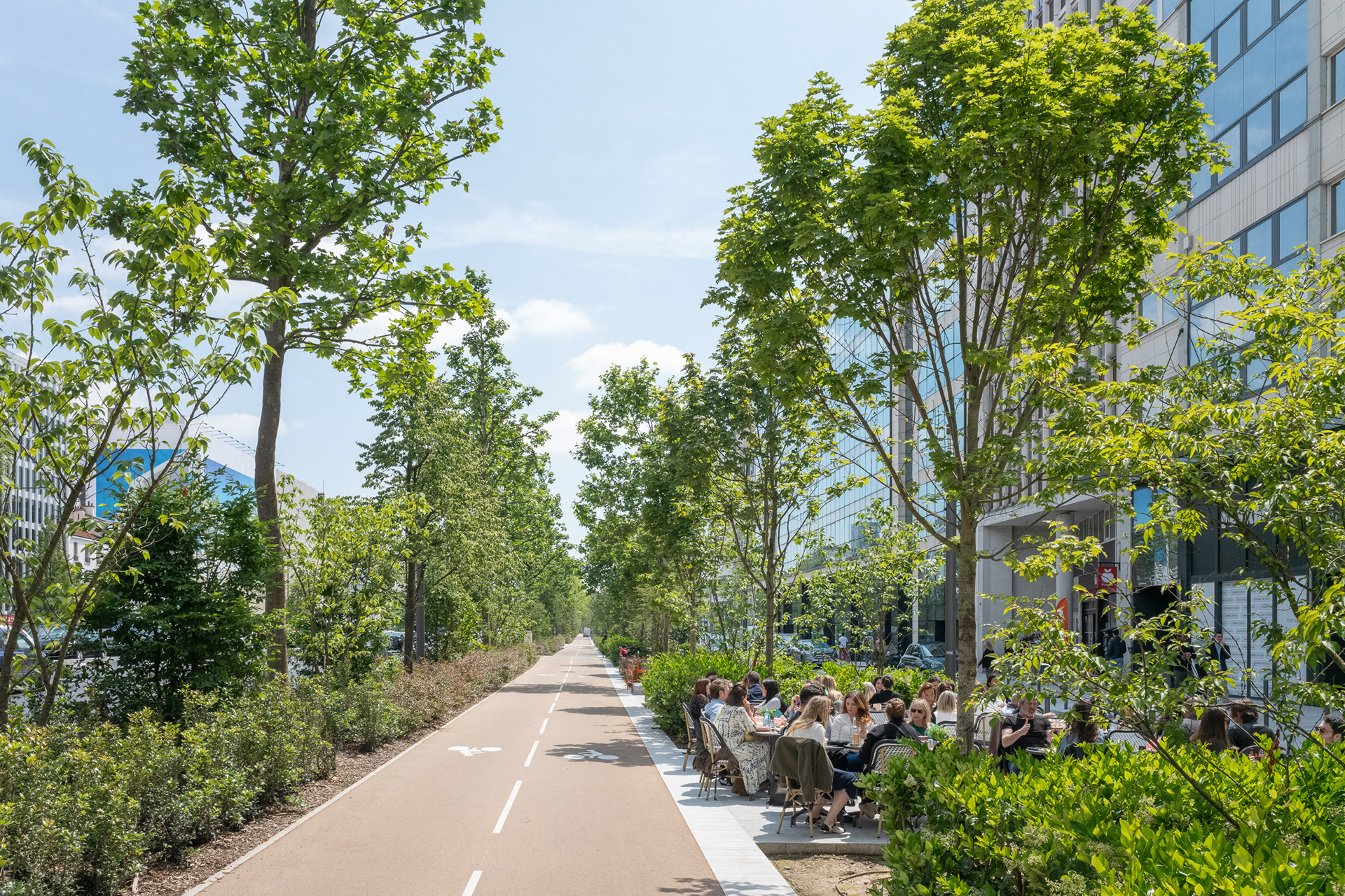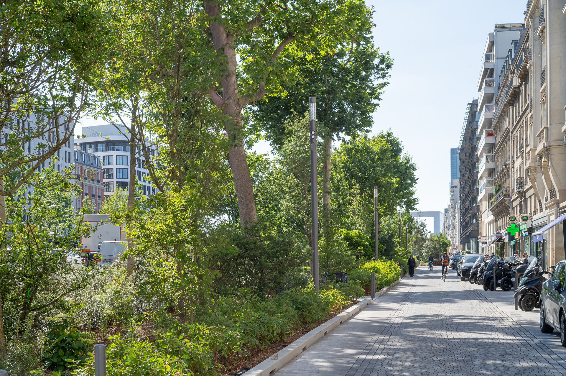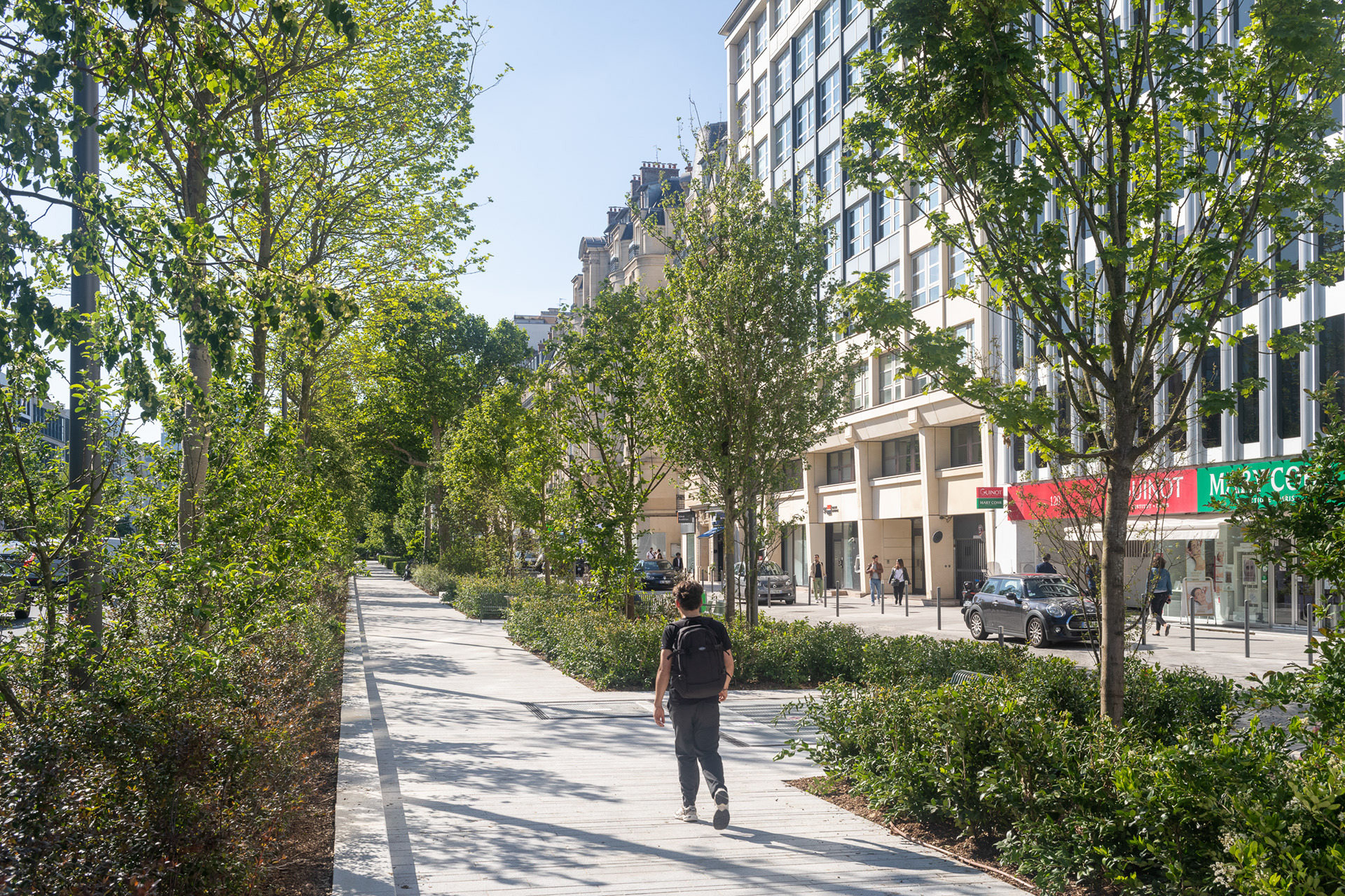 Sur l’avenue Charles-de-Gaulle, au cœur de l’Axe Majeur, Ilex libère l’espace occupé par l’automobile et transforme les contre-allées